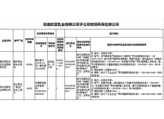 云南歐亞乳業(yè)有限公司子公司牧場(chǎng)環(huán)保信息公示