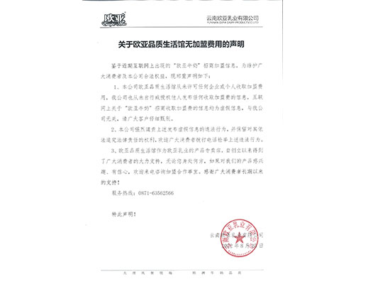 關(guān)于歐亞品質(zhì)生活館無(wú)加盟費(fèi)用的聲明
